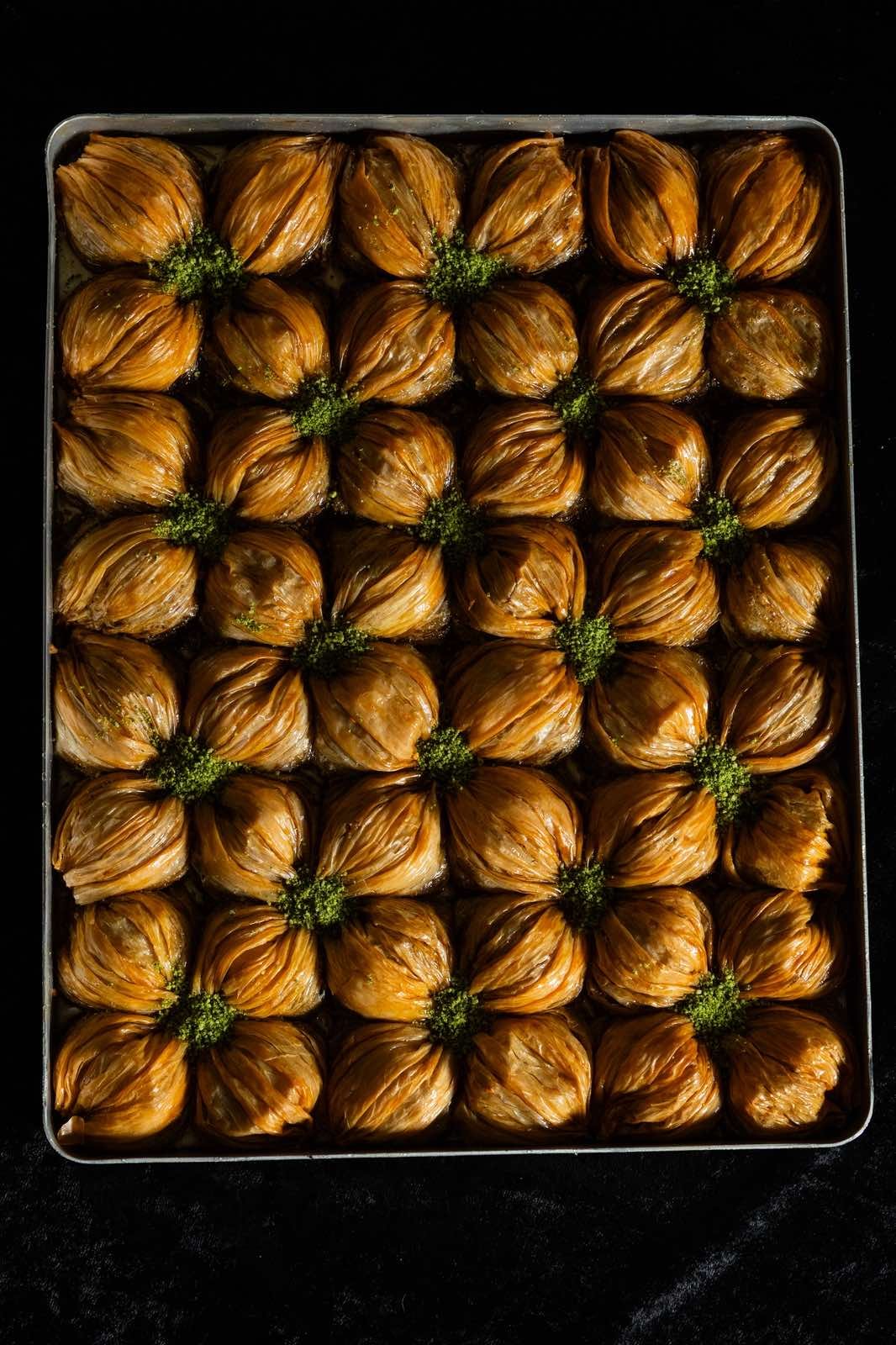 Мидје Баклава – елегантна баклава во форма на школка („мидја“), со богат фил од јаткасти плодови и сочен шербет. Еден плех содржи 48 парчиња, идеално за помали прослави и посебни пригоди.